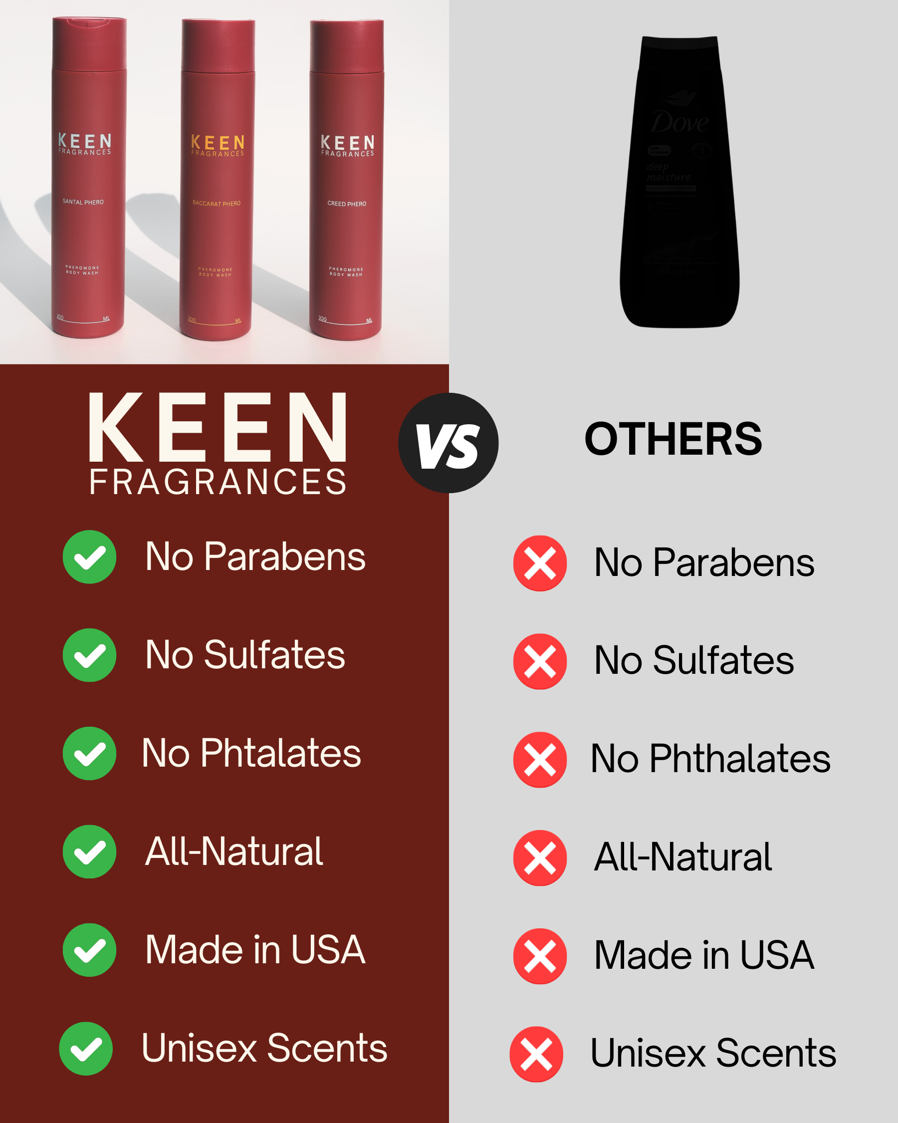 At KEEN Fragrances, our body wash is sulfate-free, ensuring a gentle yet effective clean. It keeps your skin's natural moisture intact, reducing dryness and irritation. We use natural, eco-friendly ingredients that are kind to your skin and the environment. Enjoy a luxurious lather and refreshing clean, knowing our product supports both your skin's health and the planet.